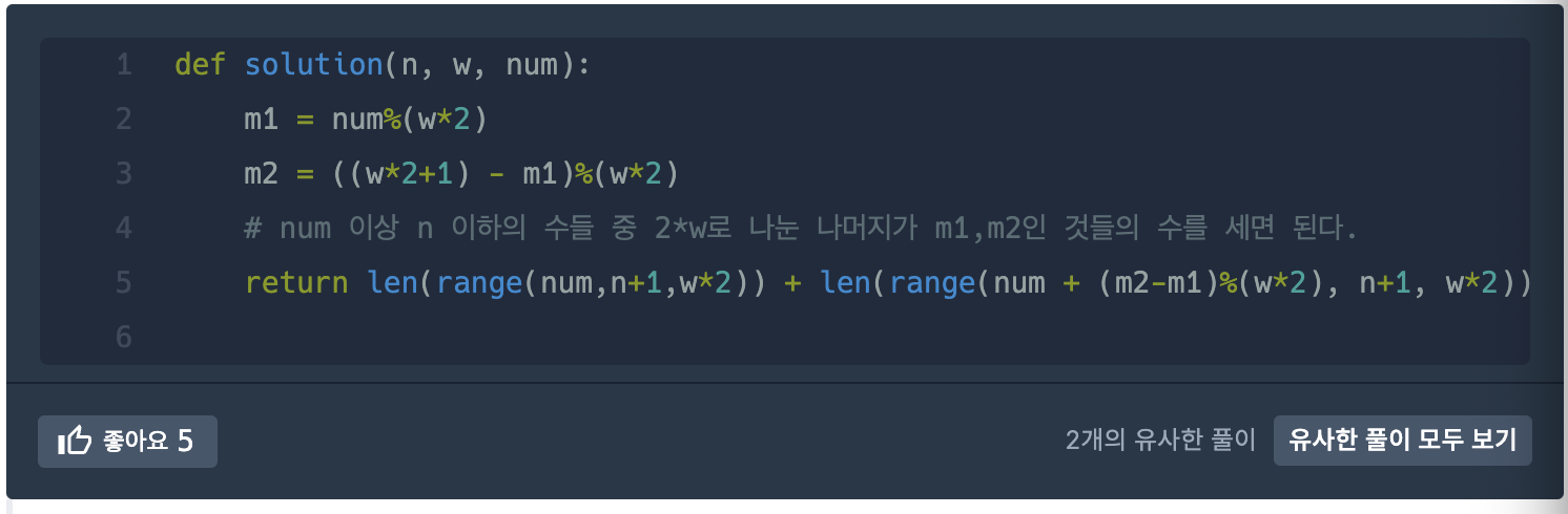 문제에 대한 조건을 설명하면 가로로 몇 개를 놓을 것인지 w로 입력이 들어오고 총 상자가 몇 개인지 n으로 입력이 들어온다.