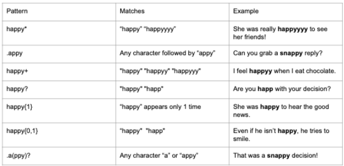 Regular Expressions can determin the followings: (가능한 패턴 매칭의 예제를 보여준다고 생각하면 됨)