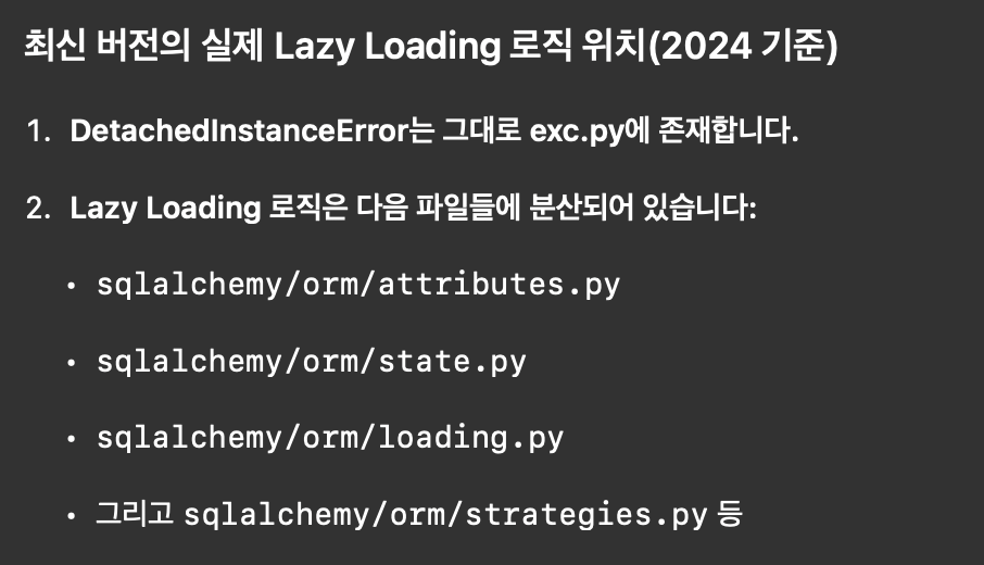 하지만 세션이 닫힌 뒤에 lazy loading 접근 시 오류 발생한다. (DetachedInstanceError -> 에러코드에 대해서 어떤 로직? 추가 분석 필요)
