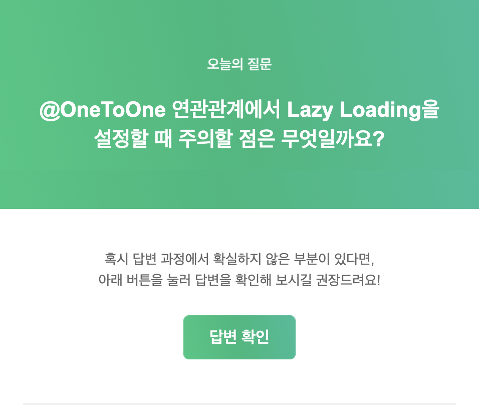 그래서 JPA는 null 혹은 프록시 객체 중 무엇을 초기화 할 지 결정할 수 없게 되고 결과적으로 엔티티의 존재 여부를 확인하는 추가 쿼리를 실행하기 때문에 Lazy Loading이 동작하지 않는다. JPA의 한계이기 때문에 단방향으로 모델링하거나 Lazy Loading이 정말 필요한 것인지 확인해봐야 한다.